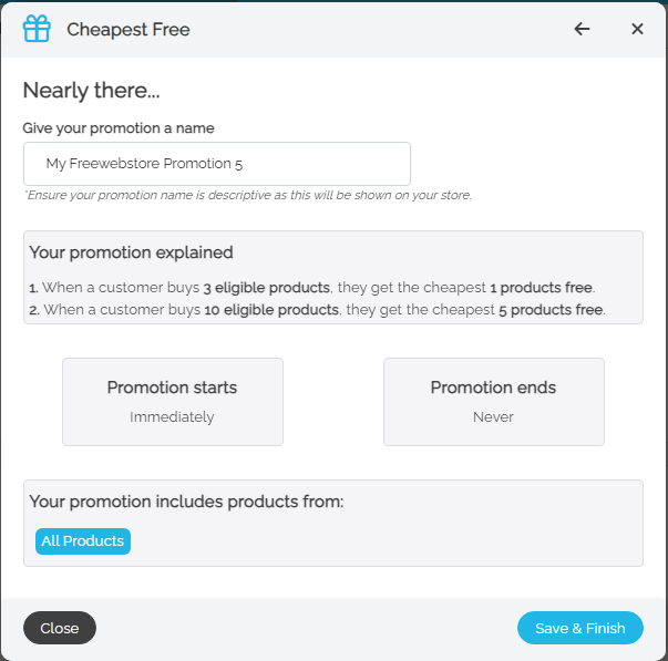 Click **Save & Finish** to save the promotion and complete the set-up wizard.